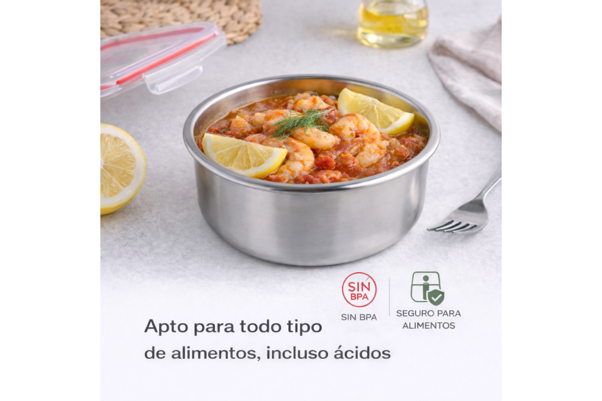 Container with high-quality stainless steel base suitable for oven, microwave, and air fryer.