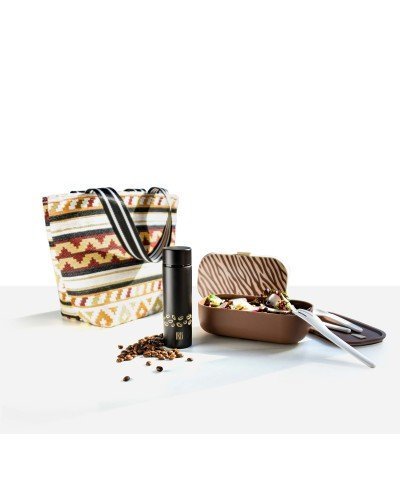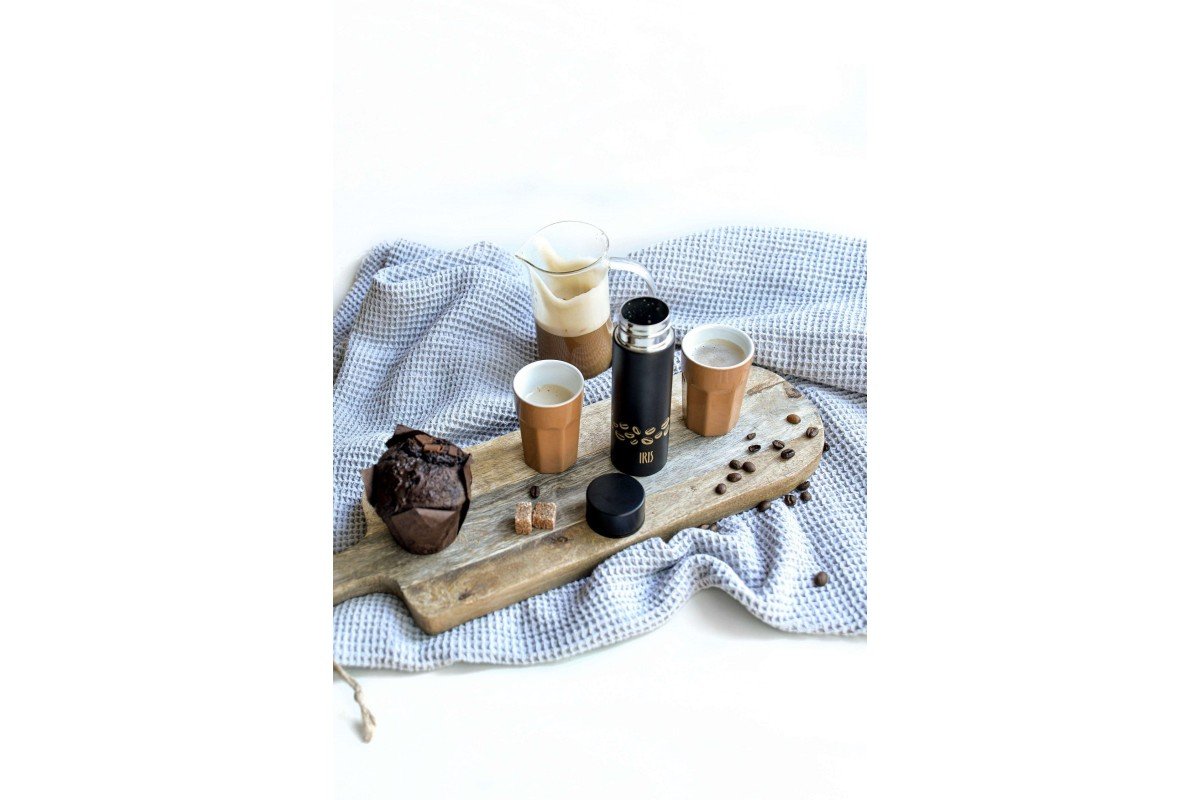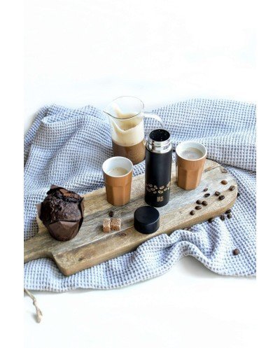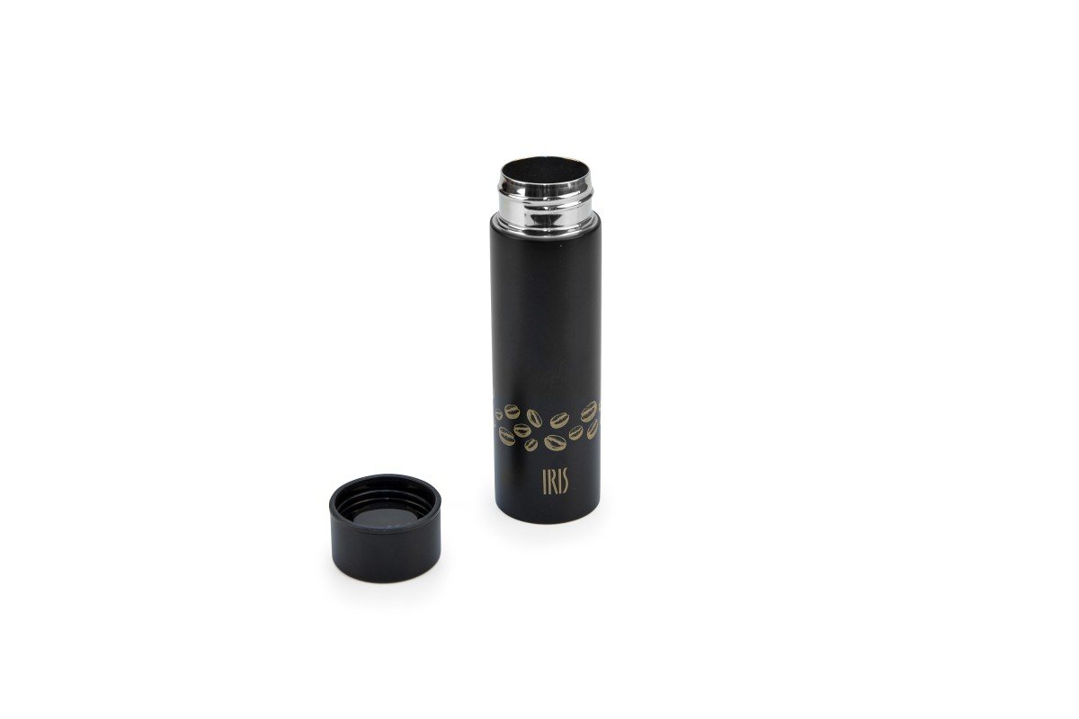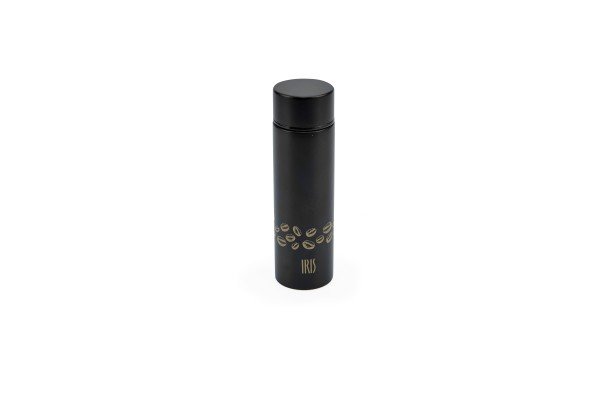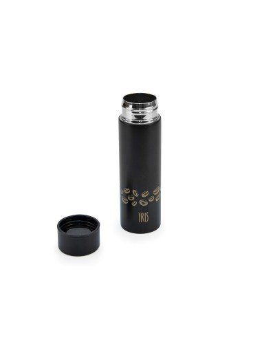 Mini stainless steel vacuum flask for coffee with a thermal efficiency of 9 hours hot and 12 hours cold. Capacity for two cups of espresso coffee. Screw cap.