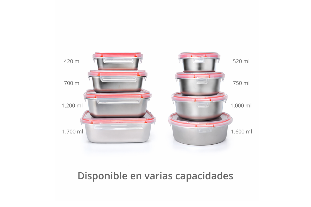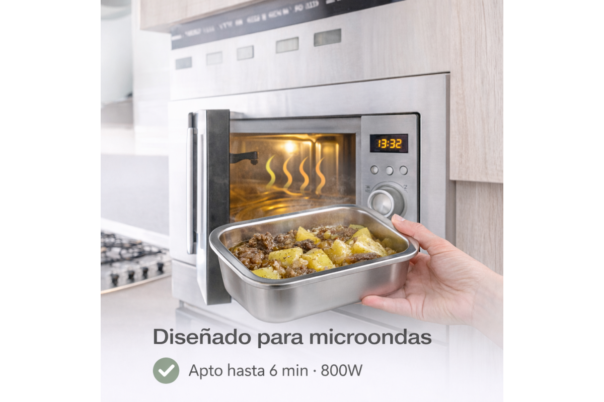 Contenant avec base en acier inoxydable de haute qualité adapté au four, micro-ondes et friteuse à air.
